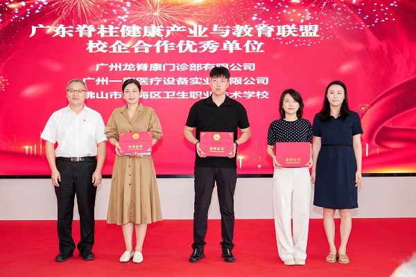 其中,广州龙脊康门诊部有限公司荣获“广东脊柱健康产业与教育联盟校企合作优秀单位”称号,龙脊康董事总经理沈晔女士代表企业上台领奖。这一荣誉不仅是对龙脊康推动脊柱健康教育与产业融合工作的高度认可,更彰显了企业在践行社会责任、助力康养人才培养方面的担当。
