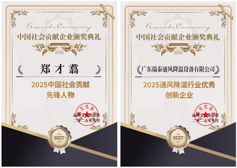 广东瑞泰通风降温设备有限公司凭借卓越成就,成功斩获“2025通风降温行业优秀创新企业”奖项;其掌舵人郑才翥董事长,因植根行业二十余年的深厚积淀与杰出贡献,荣膺“2025中国社会贡献先锋人物”大奖。