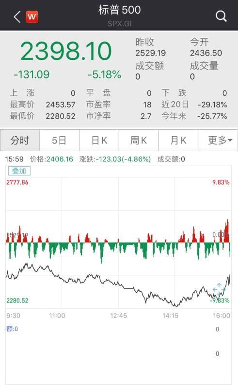 恢复交易后,美股跌势不减,道指一度跌逾2300点,纳指盘中也暴跌近650点。截至收盘,道指跌超6%至19898.92点,纳指下跌4.7%至6989.84点,标普500指数跌5.18%至2398.1点。