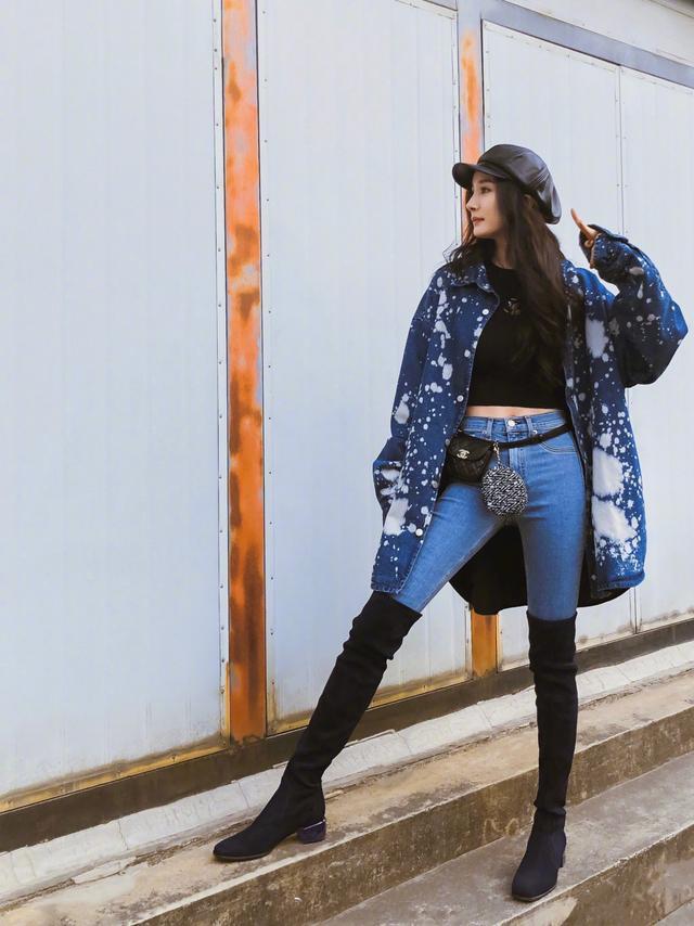 也可以使用同色系穿搭来增加造型的高级感!仔细观察杨幂的穿搭,不难发现,大幂幂运用黑色与蓝色的相互穿插塑造出别有风味的造型,蓝色牛仔裤与牛仔外套的同色系完美的强调了姣好的身材和俏皮的动感魅力。黑色露腹短上衣和过膝长靴的配衬更是体现出浓浓的女人味!