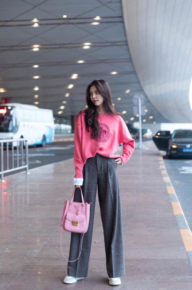 粉色造型也可以酷酷的!学着宋妍霏搭配上一条中性气息十足的长裤就可以了,不但能扭转粉色的娇滴滴感,还能让双腿看起来更加修长!