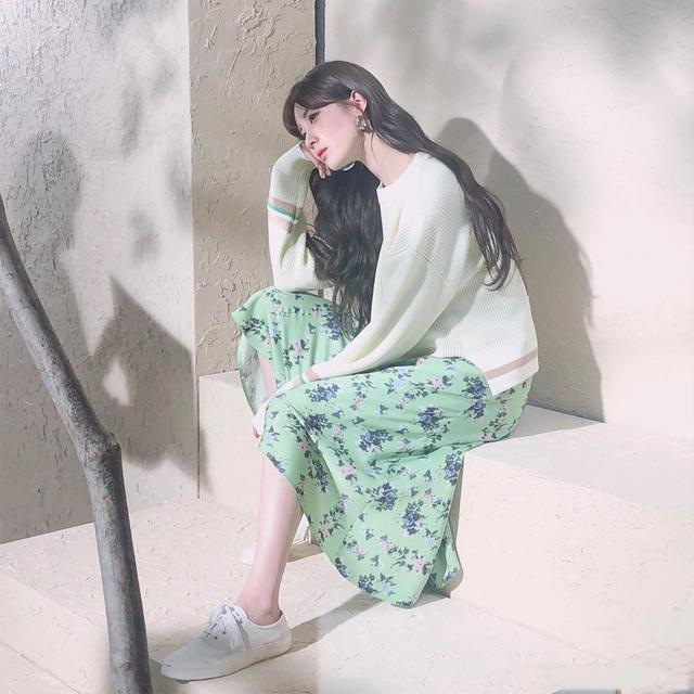 那么除了黑白色之外,搭配杏色、咖色或是淡淡的马卡龙色也很不错呢!徐珠贤用有着马卡龙条纹的针织上衣搭配治愈人心、朝气蓬勃的绿色印花长裙,给人一种甜而不腻、舒缓淡雅的女神气息。相信穿搭这种恬静温和配色的女生一定会化身气质系欧尼的!