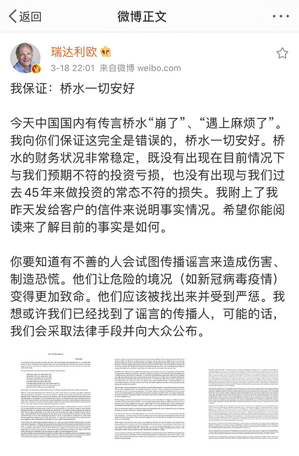 当天晚间,桥水基金创始人瑞·达利欧(Ray Dalio)在其微博上回应称:“我保证:桥水一切安好”。
