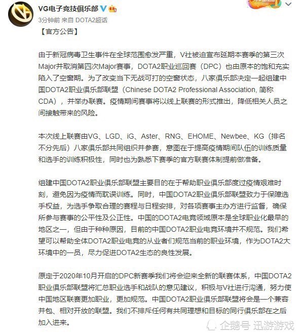 VG官方发布了微博表示新的DOTA2联赛即将登场亮相。据了解,由于新冠病毒卫生事件在全球范围愈发严重,V社被迫宣布延期本赛季的第三次Major并取消第四次Major赛事,DOTA2职业巡回赛(DPC)也由原本的饱和充实陷入了空窗期。为了改变当下无战可打的空窗状态,八家俱乐部决定一起组建中国DOTA2职业俱乐部联盟(Chinese DOTA2 Professional Association, 简称CDA),并举办联赛。