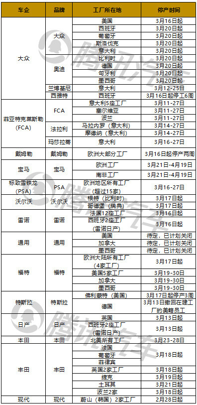 据腾讯汽车不完全统计,截至3月19日,包括戴姆勒、大众、菲亚特克莱斯勒集团(FCA)、标致雪铁龙集团(PSA)等在内的12家海外车企已经关停或计划关停的工厂将超过100家。